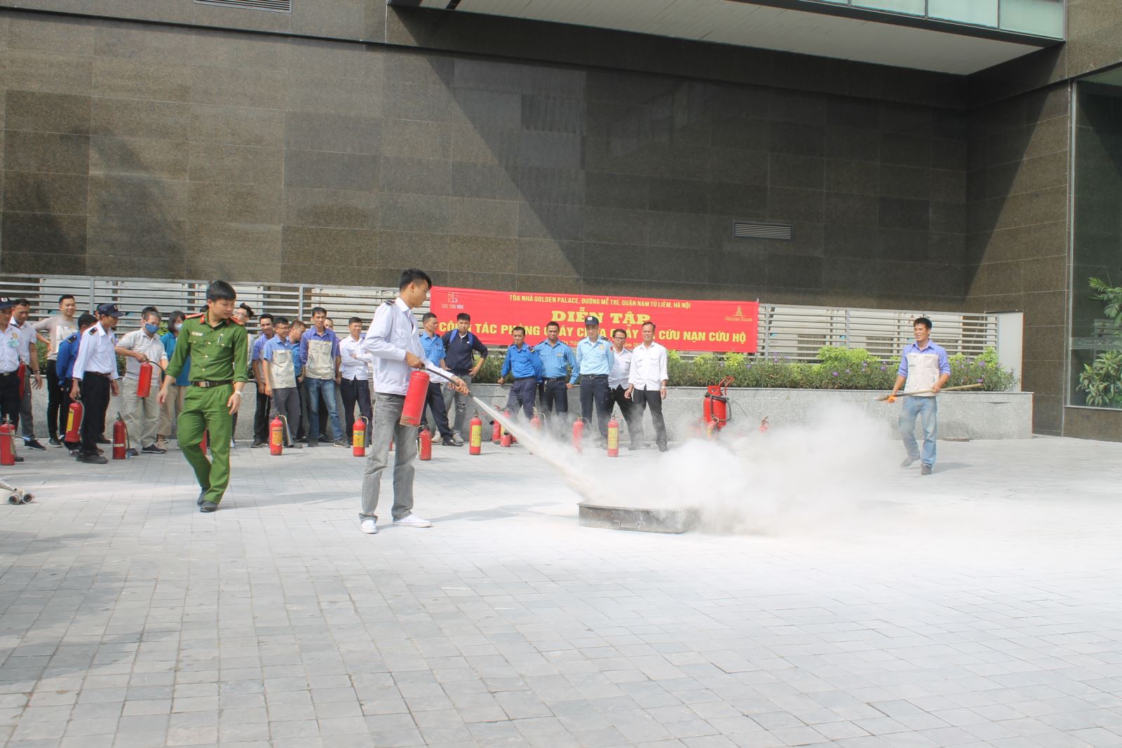 Các nhân viên Công ty Hà Nội Xanh quản lý khối đế, Ban quản lý tòa nhà, Nhân viên các Công ty làm việc tại khối đế tòa nhà Golden palace được tham gia học lý thuyết và thực hành diễn tập dập tắt ngọn lửa tại chỗ khi có cháy xẩy ra.